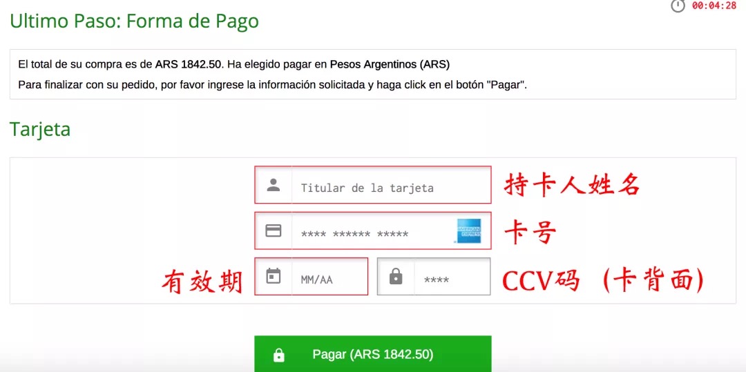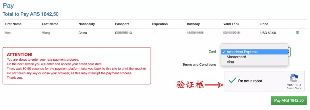 付款金额为50美元的等值阿根廷币,接受Visa/Mastercard/AmericanExpress等信用卡: