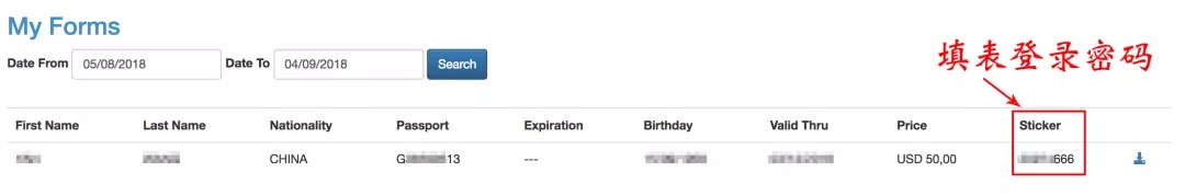 注意那个Sticker号码即为之后填申请表的登陆密码。