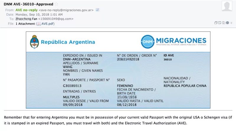 2016年9月1日,阿根廷电子旅行许可(AVE,俗称电子签)申请系统正式上线,费用$50。