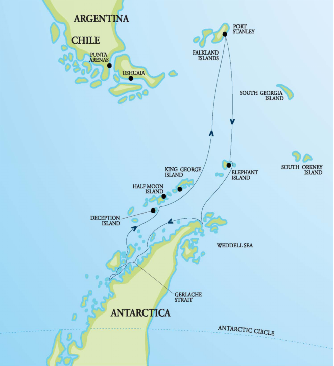 一般是去程在智利彭塔阿雷纳斯,乘坐专机飞跃德雷克海峡,到达乔治王岛智利站,随后登船开始南极的探险,回程选择乘坐邮轮,船越德雷克海峡,在阿根廷的乌斯怀亚下船。