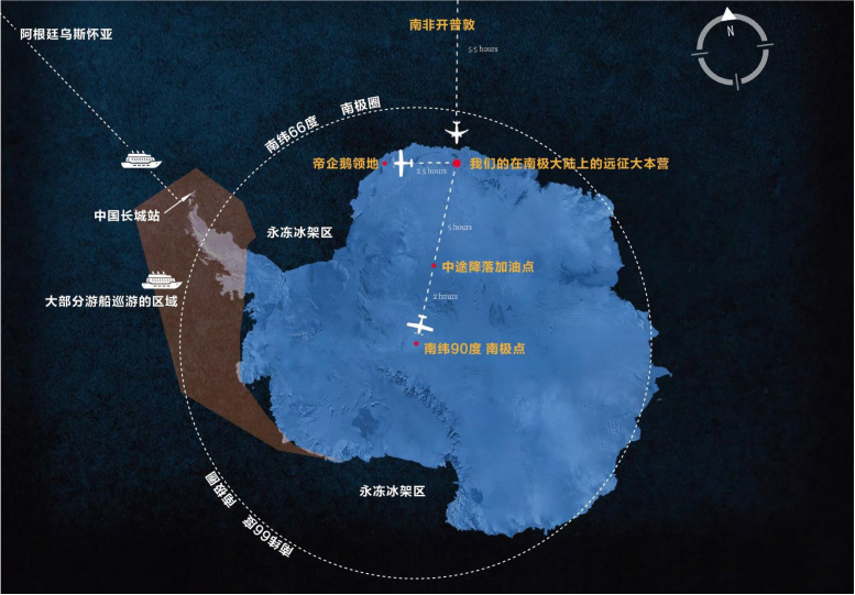 目前达到南极点基本是从国内飞到南非开普敦,从开普敦飞5.5小时到达远征大本营