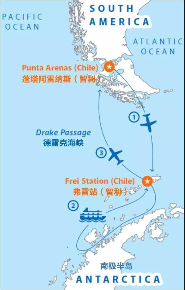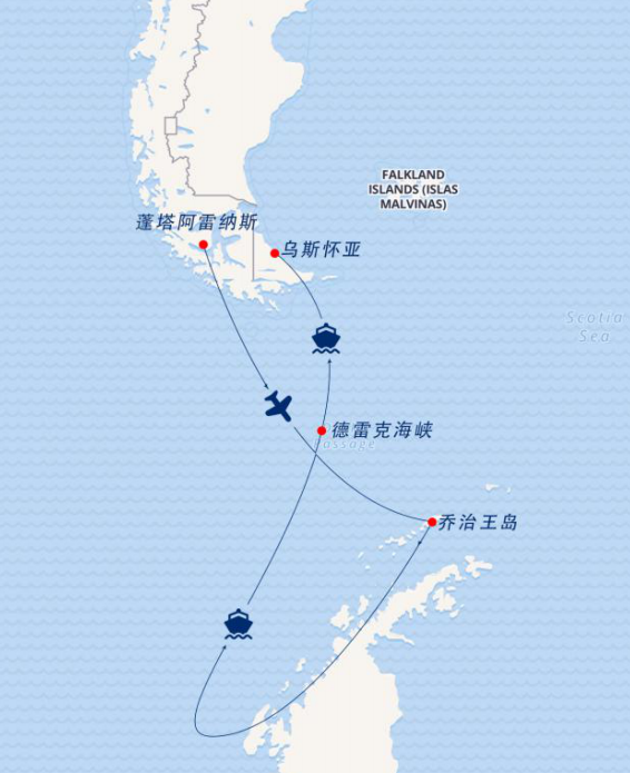 一般是是从智利彭塔阿雷纳斯小镇乘坐专机,直接飞跃德雷克海峡,目的是乔治王岛智利站,随后在登船出发去南极半岛巡游。