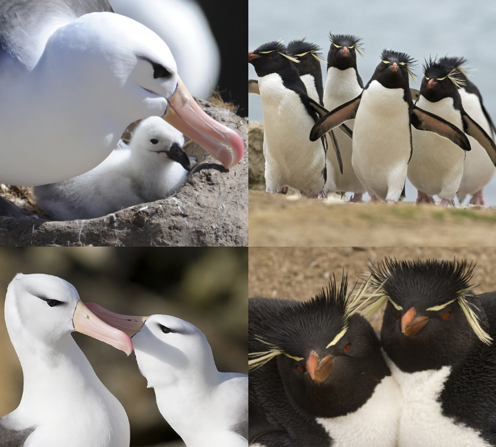 有大约65种不同种类的鸟,包括黑眉信天翁、福克兰鷚、游隼和条纹长脚鹰;